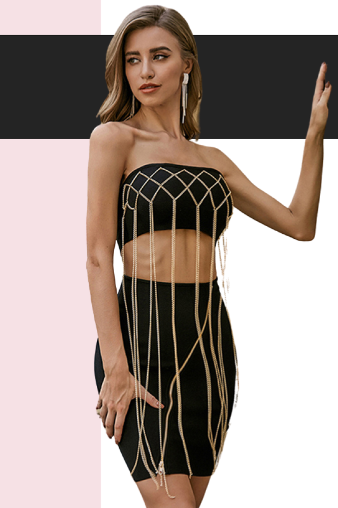 فستان أسود قصير قطعة واحدة مفتوح جهة البطن والظهر، يتميز بتصميم مكشوف الأكتاف والسلاسل الذهبية. يحتوي على سحاب جهة التنورة. يعتبر هذا الفستان من أفخم الخامات وأرقاها، مما يساعد في شد الجسم وإظهار الجمال.